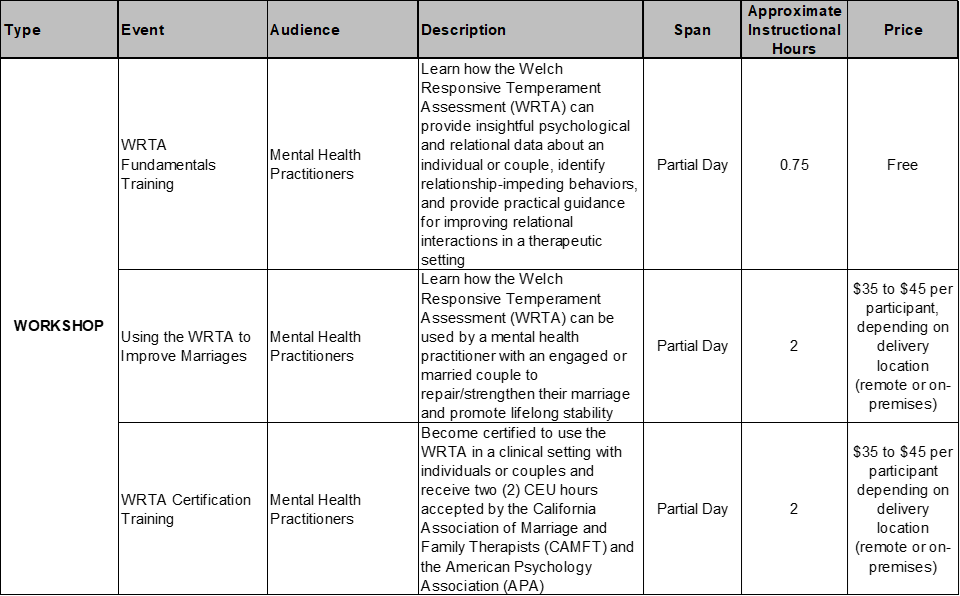 We offer a variety of WRTA workshops to fit your needs: CONTACT US for more information and scheduling